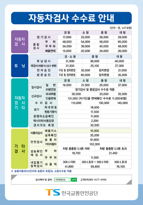 한국교통안전공단 기준 수수료는 아래와 같으며, 지정정비사업자는 상이할 수 있습니다.