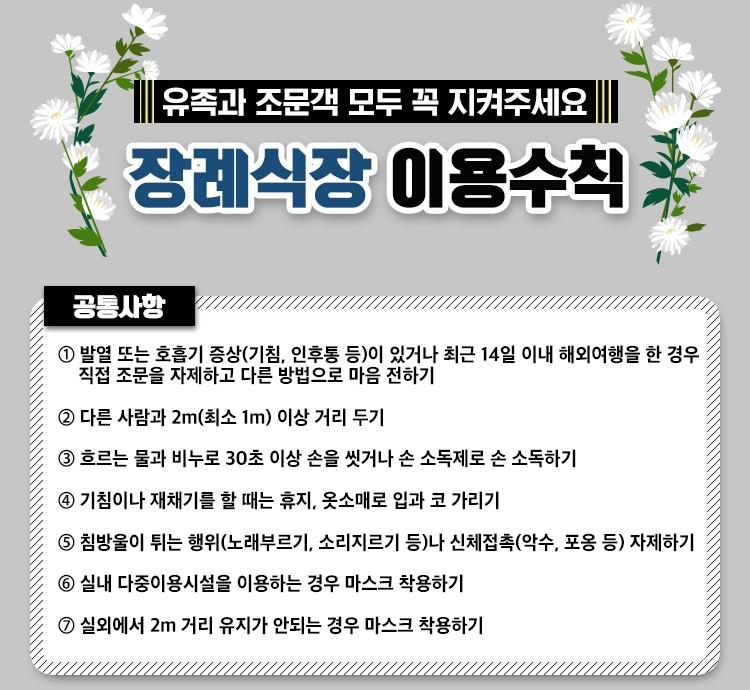꼭 방문해야 하는 자리일 경우에는 마스크 착용 등 위의 이용수칙을 참고하셔서 악수 대신 목례를, 오래 머무르지 마시고 위로의 마음을 전하시기를 바랍니다.