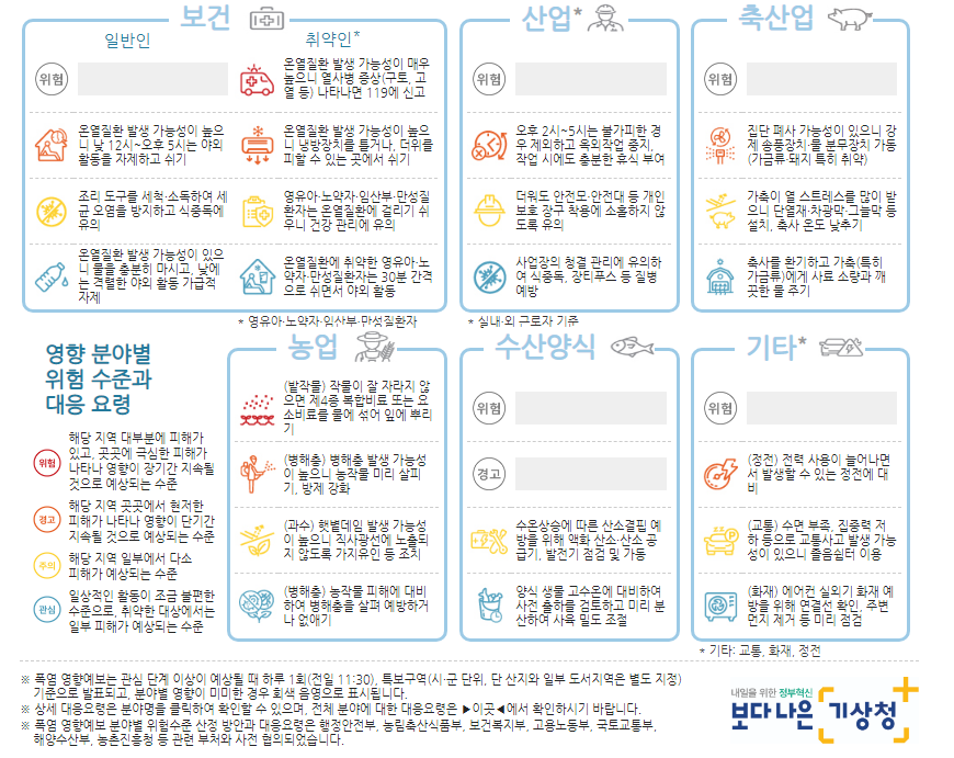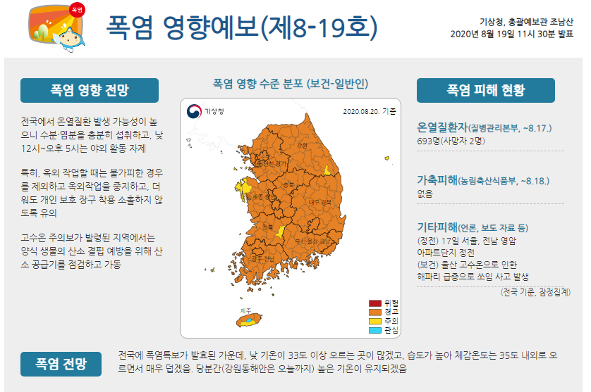 폭염은 기상 재해 중에서 가장 많은 사망자를 발생시키고 있는 만큼 기상예보를 주의 깊게 듣고, 잘 대비하여 폭염으로부터 피해를 입지 않도록 주의하셔야 합니다.