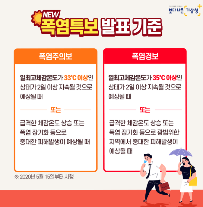 우리나라의 경우 한낮의 일 최고기온이 섭씨 33도 이상인 날이 2일 이상 지속될 것으로 예상될 때 '폭염주의보'를 발령하며, 섭씨 35도 이상으로 2일 이상 지속될 것으로 예상될 때 '폭염경보'를 발령합니다.