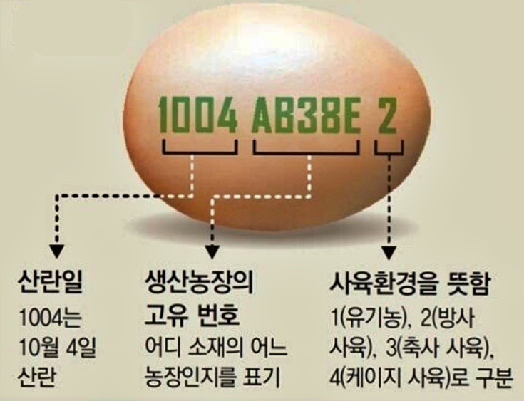 첫 번째 숫자 네 자리는 산란일을 표기하며, 끝의 한자리는 유기농, 방사, 축사, 케이지 등의 사육환경을 표시합니다.