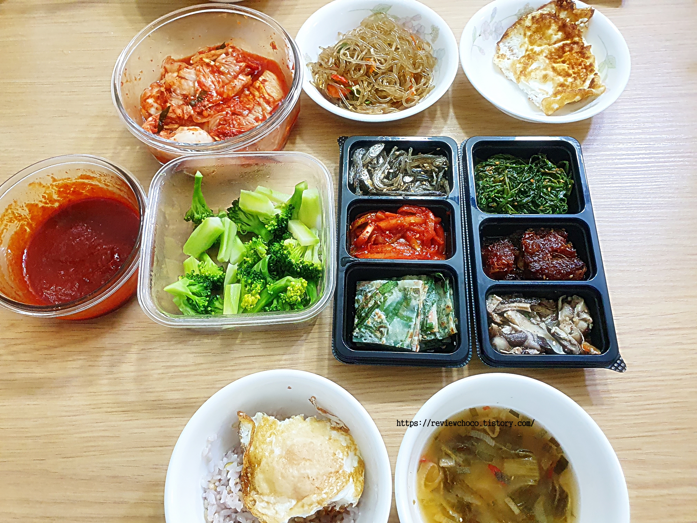이 날은 부추 부침개, 도라지 무침, 멸치볶음, 버섯볶음, 코다리 조림(?), 참나물(무슨 나물인지 모르겠습니다ㅠㅠ) + 잡채 서비스로 구성됐습니다.