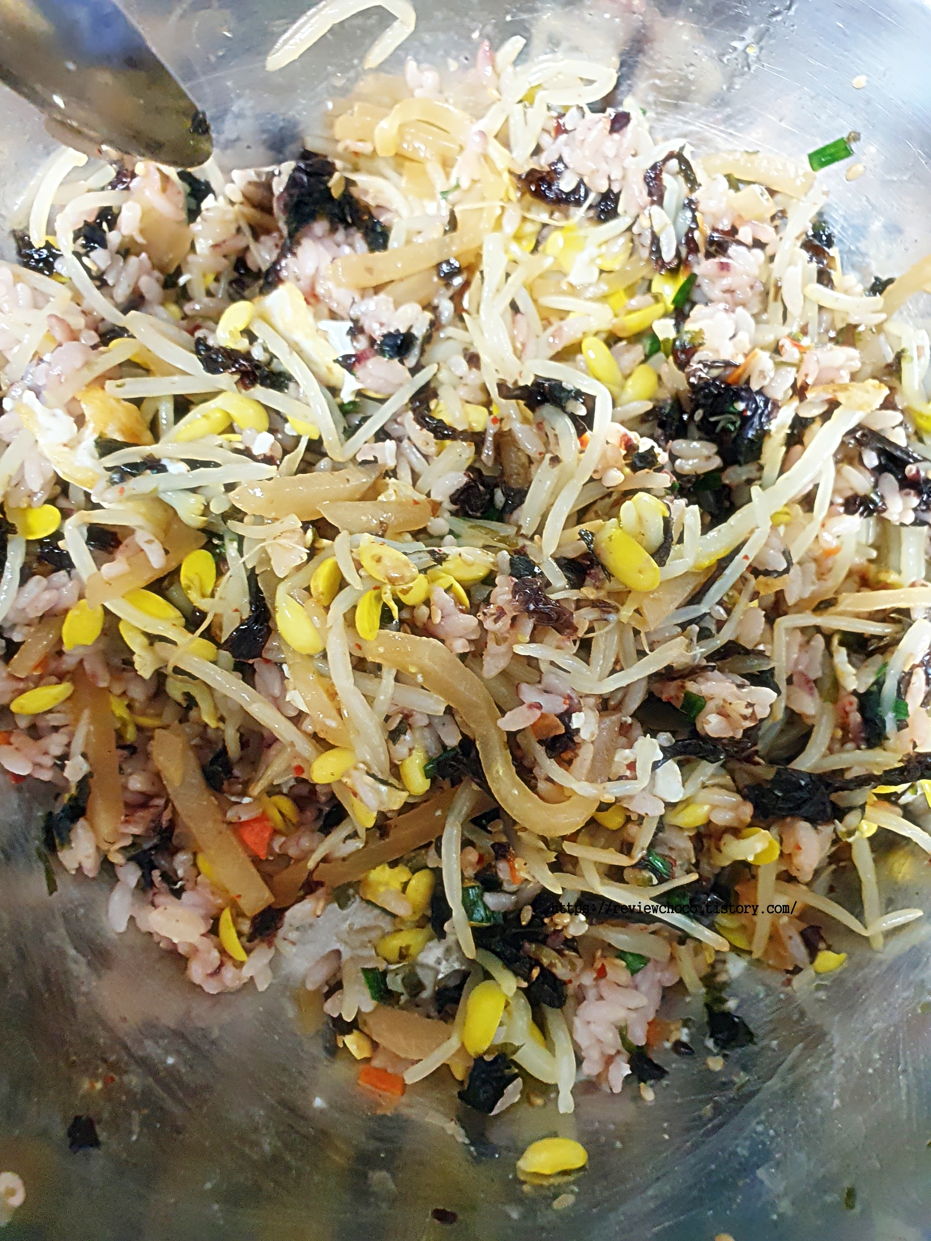 집에 있는 양푼에 옮겨 담고 김치 빼고 다 넣고 비볐어요.
