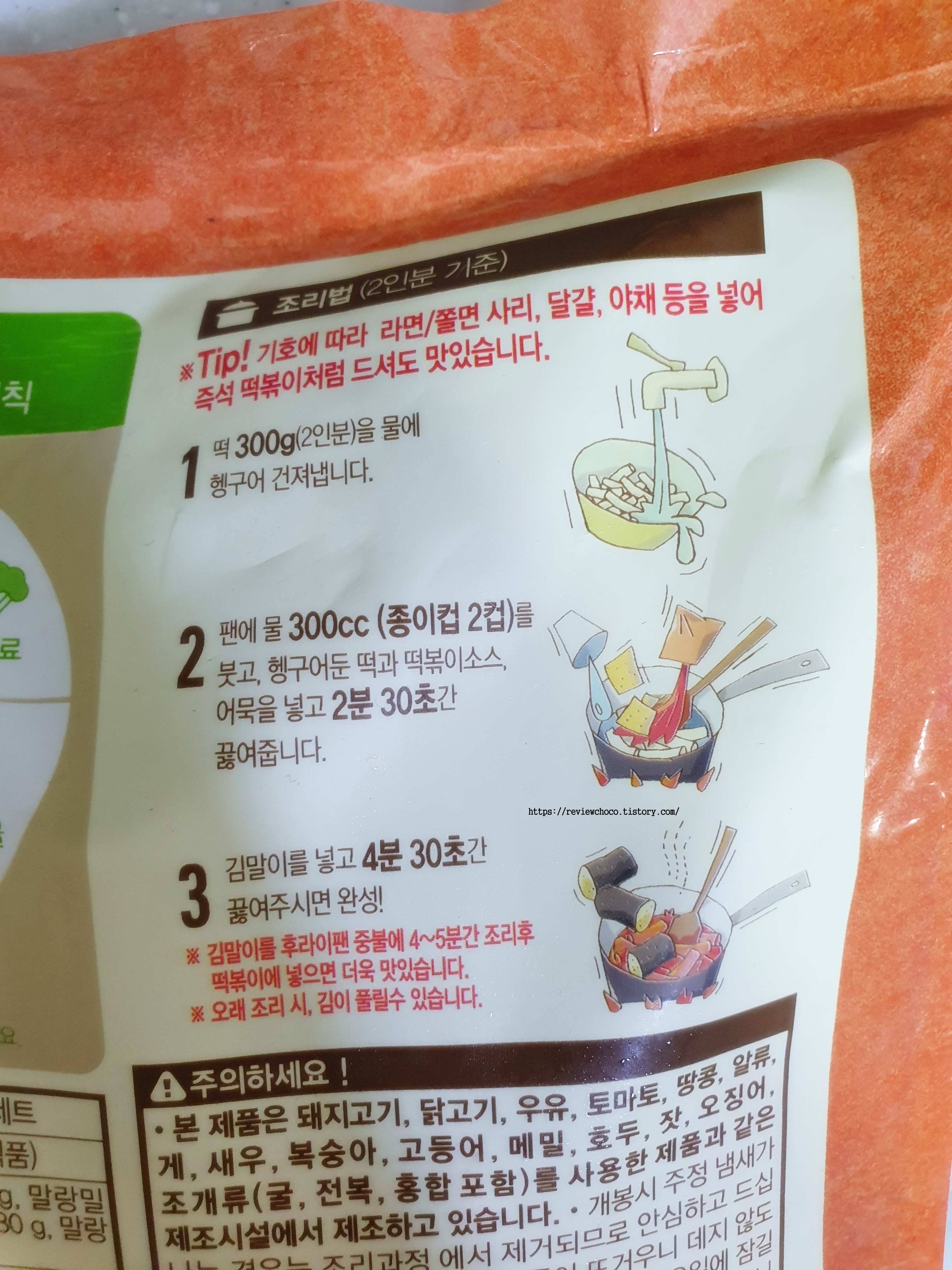 분식 세트에 들어있는 김말이는 떡볶이에 바로 넣고 끓여도 되지만, 팬에 한번 구워서 넣으면 더 맛있다고 안내되어 있습니다.