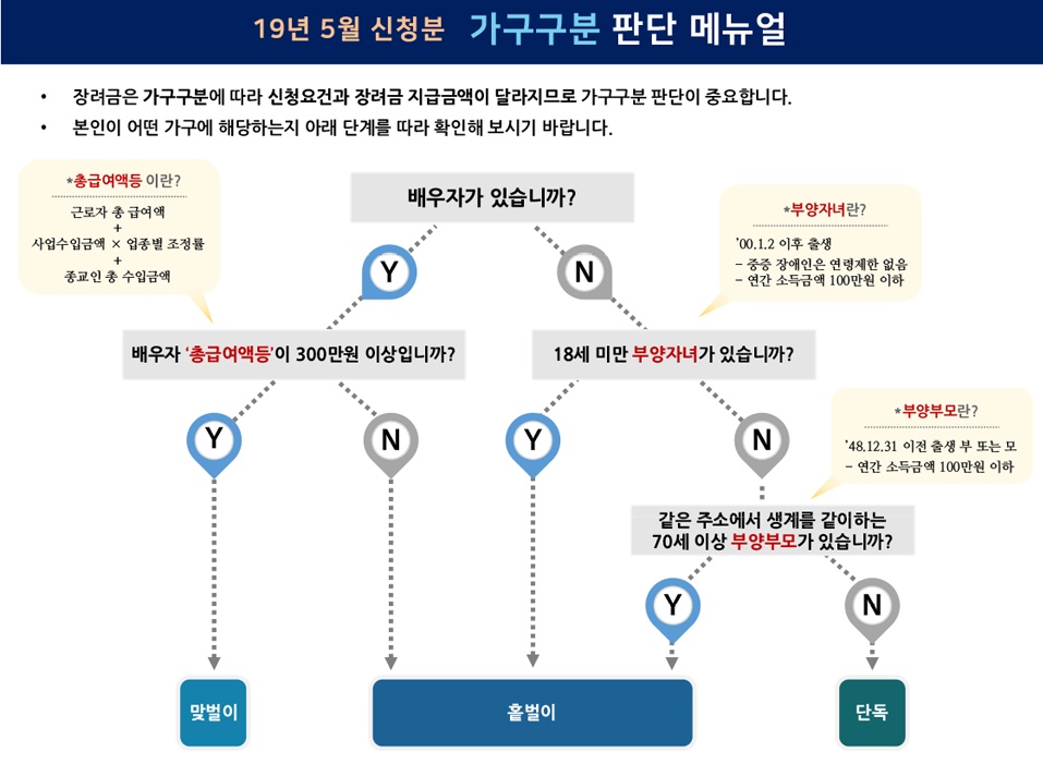 소득의 기준은 2019년 근로, 사업, 종교인 소득이 있고, 부부합산 연간 총소득이 기준금액 미만이어야 합니다.