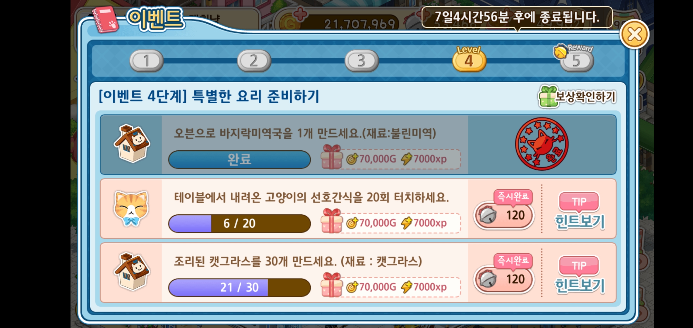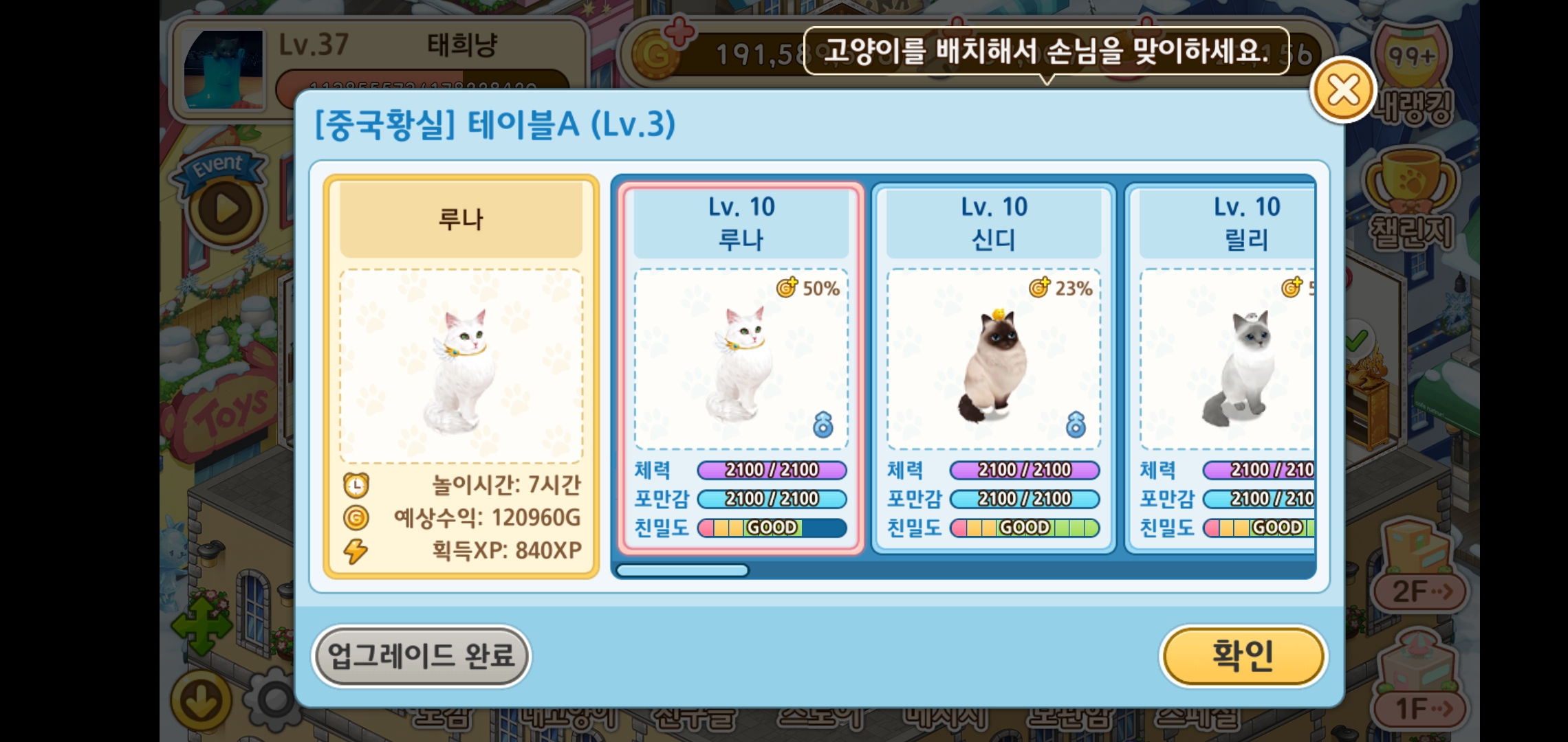 게임을 접속하면 접객을 마친 고양이들의 테이블에