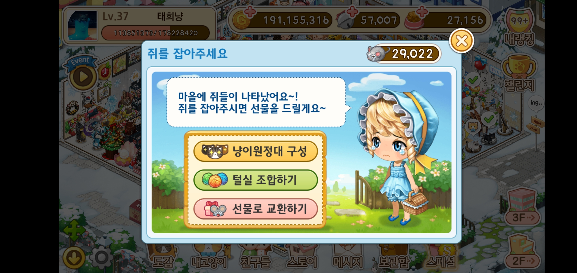 쥐와 털실을 보상으로 받아 선물로 교환할 수 있습니다.