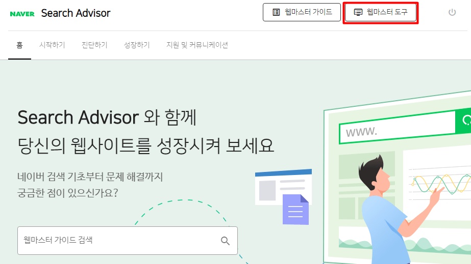 네이버에 서처 어드바이저나 웹마스터 도구로 검색하여 네이버 서치 어드바이저로 들어갑니다.