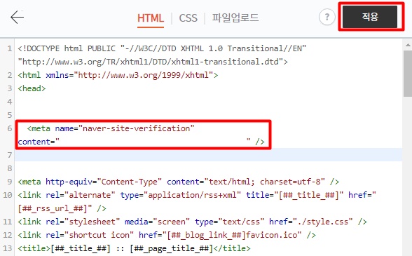 편집으로 들어와서 상단의 <head> 아래에 복사한 meta 태그를 붙여 넣기 해 준 후