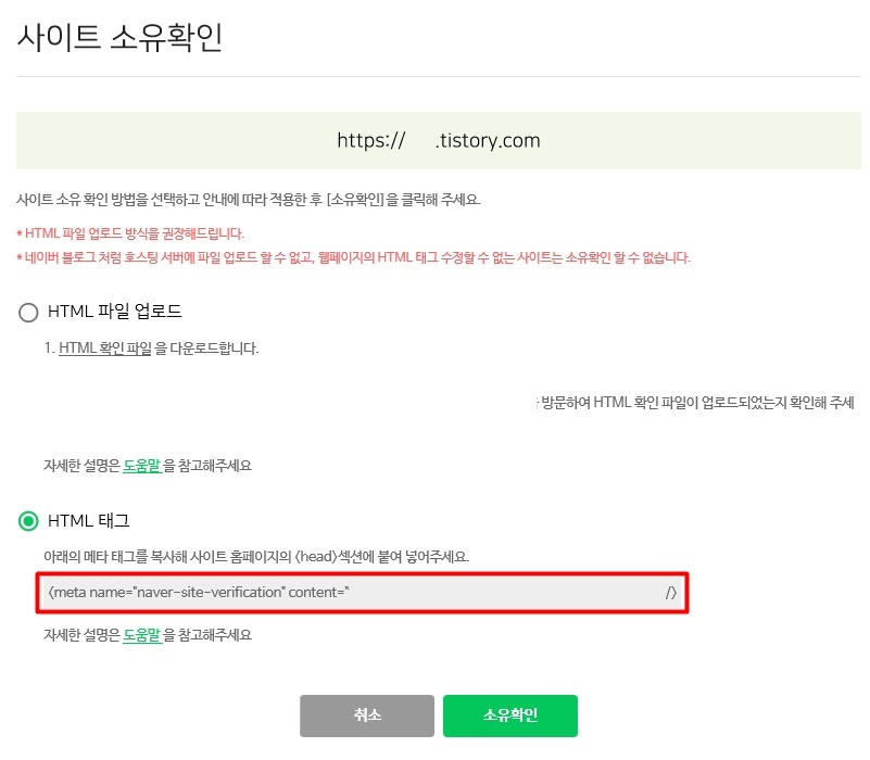 입력한 사이트가 본인의 사이트임을 확인시켜 주기 위해 메타 태그를 복사해