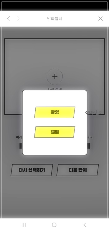 제가 설명드리고자 하는 만화 필터는 화면의 중앙 아래에 노란 말풍선으로 된 만화 필터를 선택하면서 시작합니다.