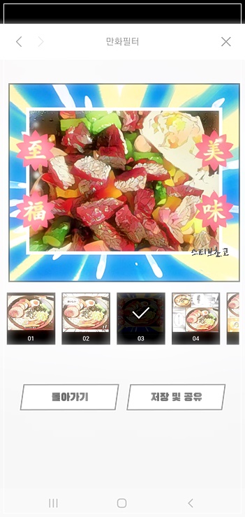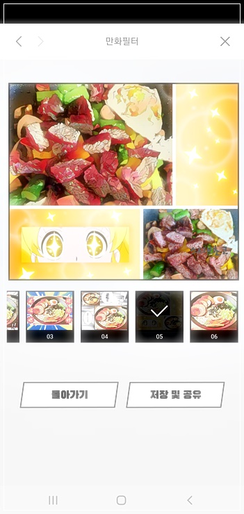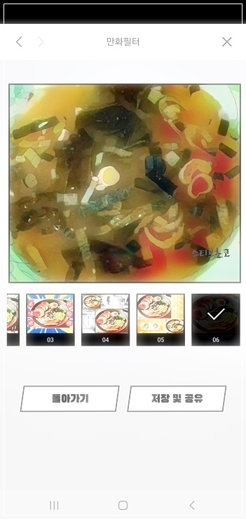 저장 및 공유를 선택하여 만화 스타일로 변환된 음식 사진을 저장할 수 있으며
