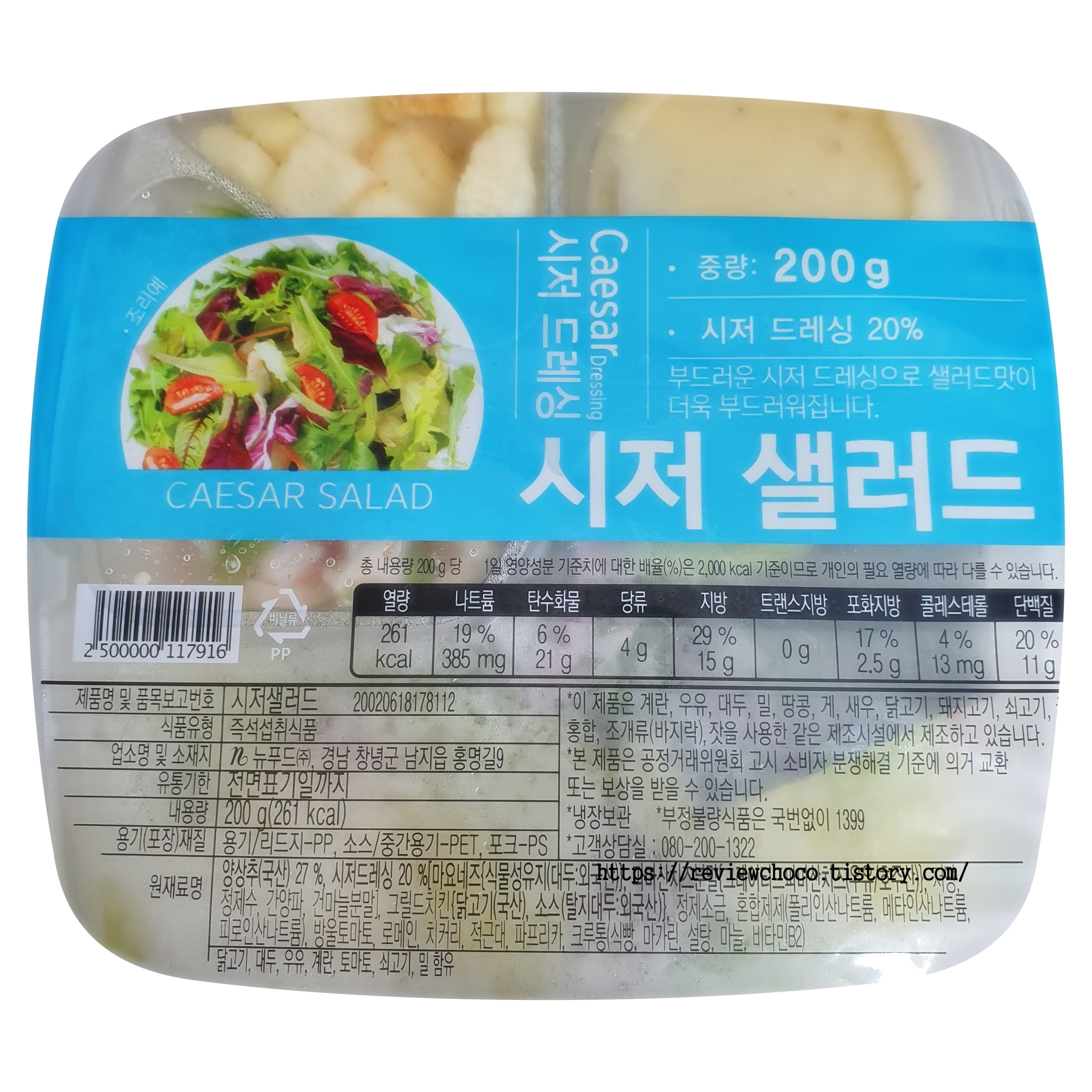 시저 샐러드에는 양상추, 그릴드 치킨, 방울토마토, 로메인, 치커리, 적근대, 파프리카, 크루통, 시저 드레싱, 파마산 치즈분말이 들어있습니다.