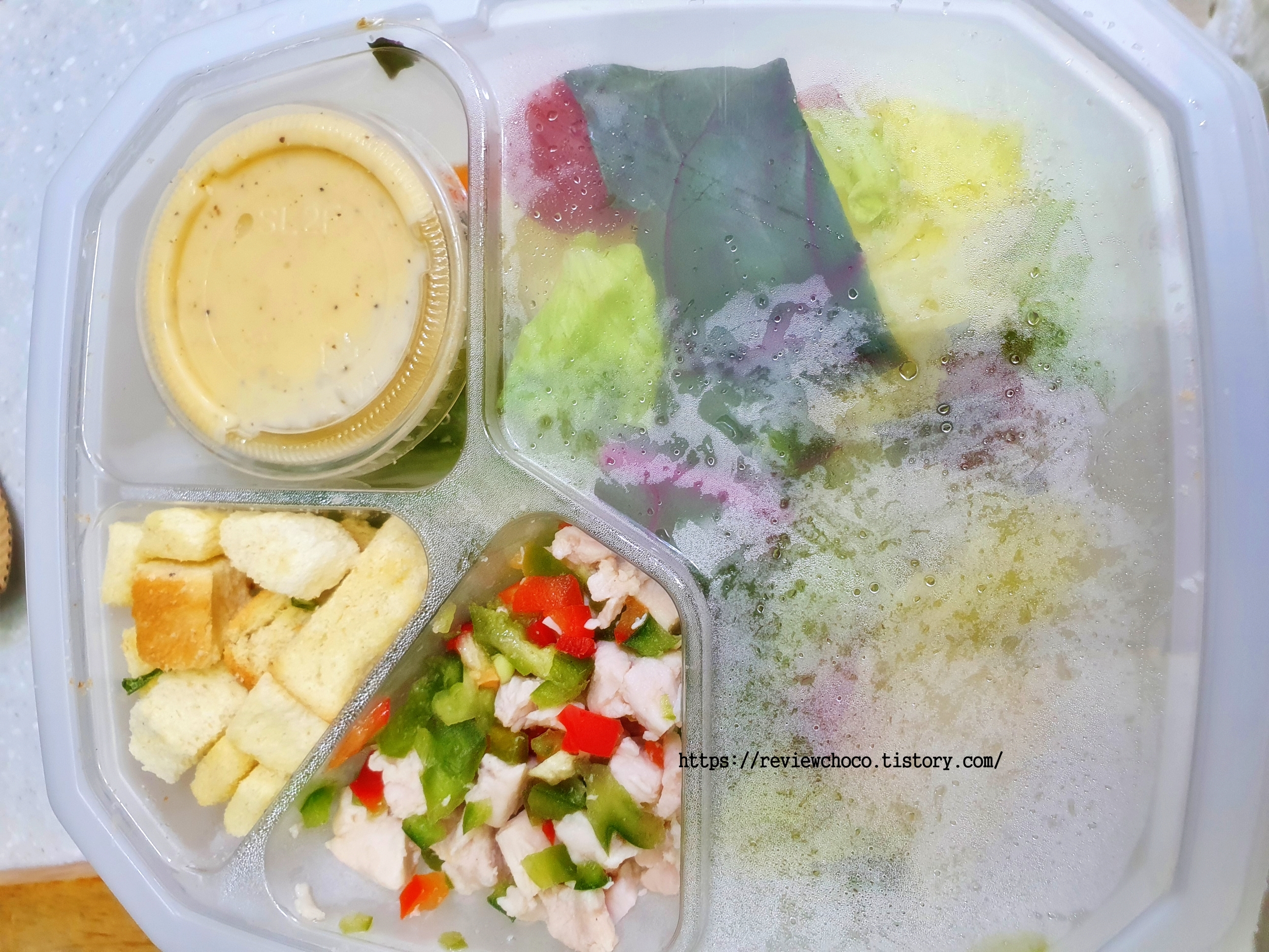 크루통, 닭가슴살, 파프리카를 모두 넣고 시저 드레싱을 뿌리고 잘 섞어서 먹으면 되는 아주 간편한 구성입니다.