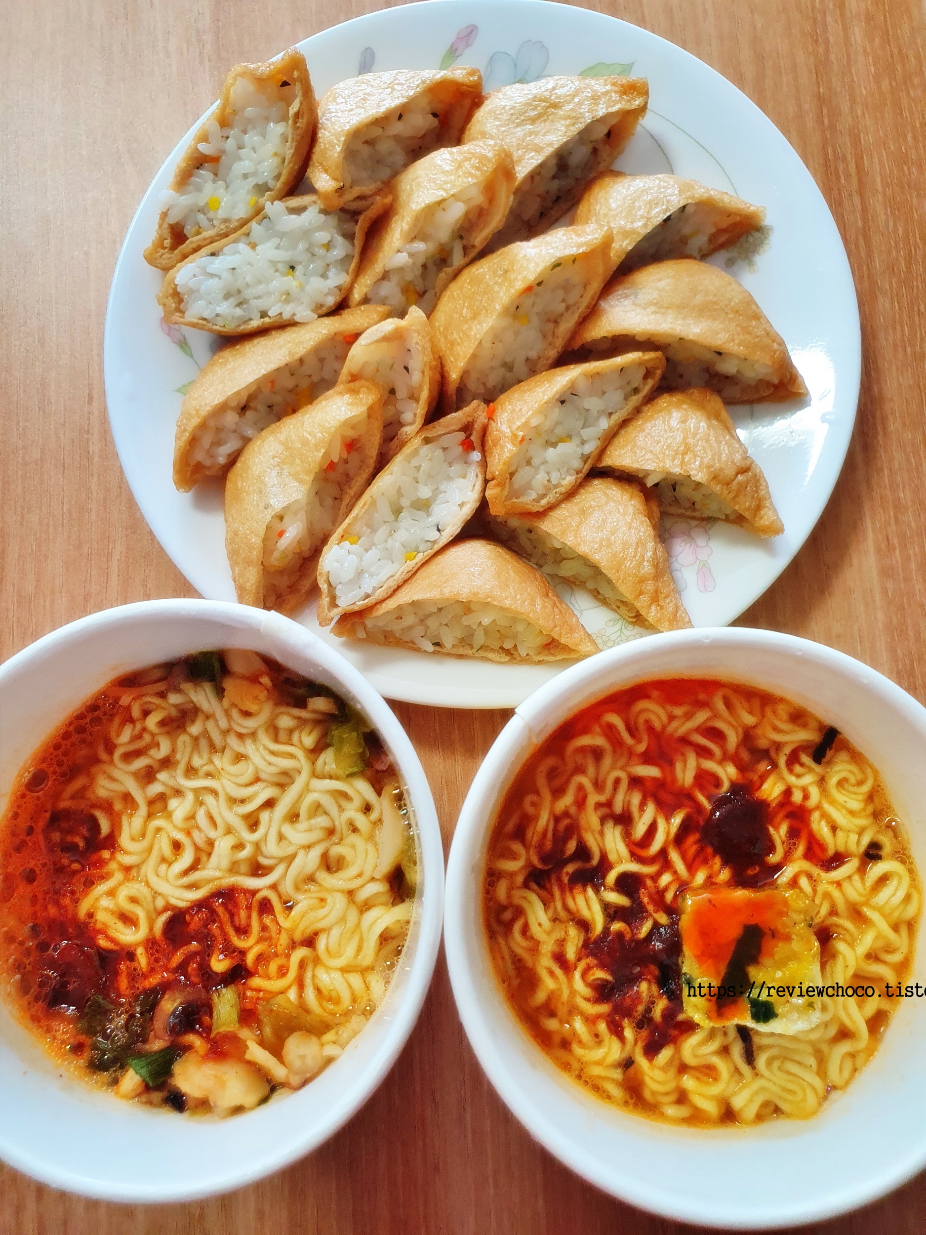 어릴 적 소풍에는 엄마가 항상 김밥을 싸 주셨었는데, 그때는 김밥을 소풍 때만 먹었지만, 지금은 자주 먹을 수 있어서, 오히려 유부초밥이 간단하기는 해도 특별식 같은 느낌이라 유부초밥으로 고르게 됐어요.