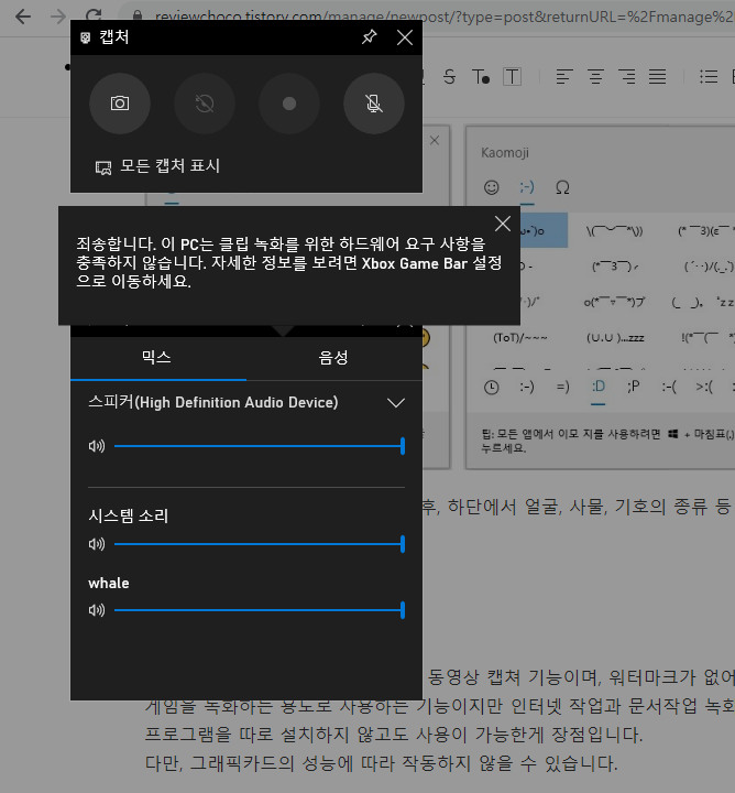 윈도우 10에서 제공하는 화면 캡처, 동영상 캡쳐 기능이며, 워터마크가 없어서 유용하게 사용할 수 있습니다.