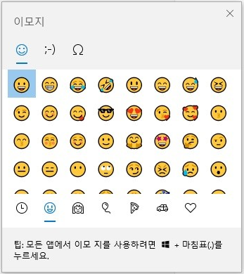 상단에서 이모지, 기호 등을 선택한 후, 하단에서 얼굴, 사물, 기호의 종류 등 세부항목을 선택하여 다양하게 사용할 수 있습니다.