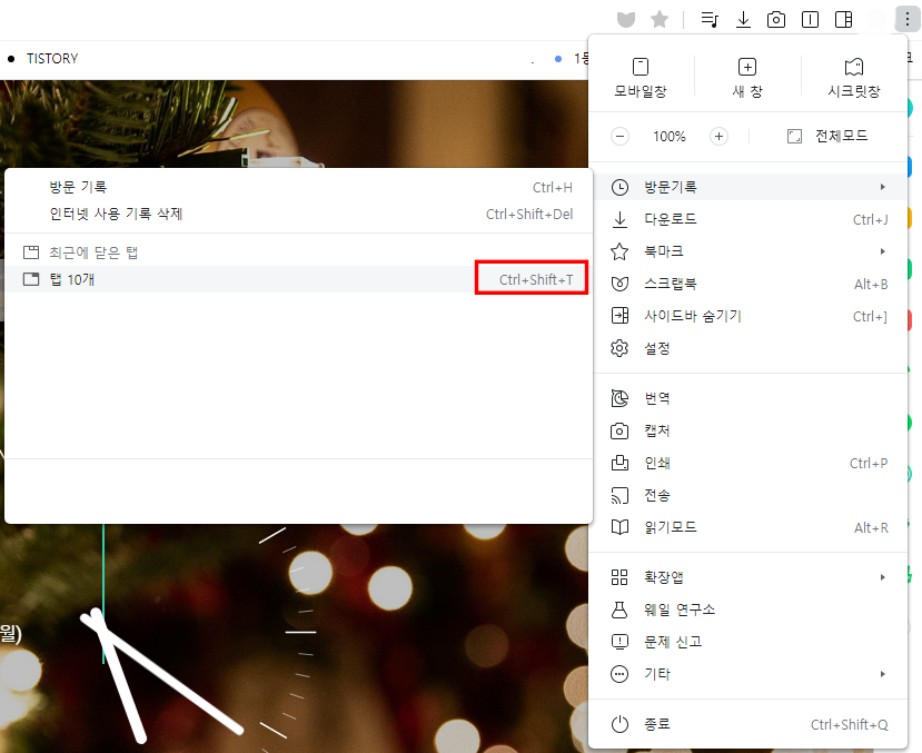 단축키를 이용하거나 브라우저의 오른쪽 상단의 세로점 세 개 클릭 -> 방문기록 -> 최근에 닫은 탭을 클릭하여
