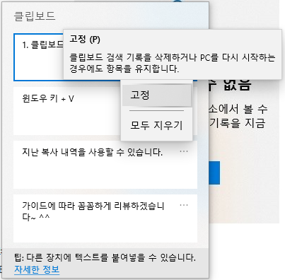 복사한 항목을 고정시키게 되면 재부팅을 하여도 클립보드에 남아있게 되어
