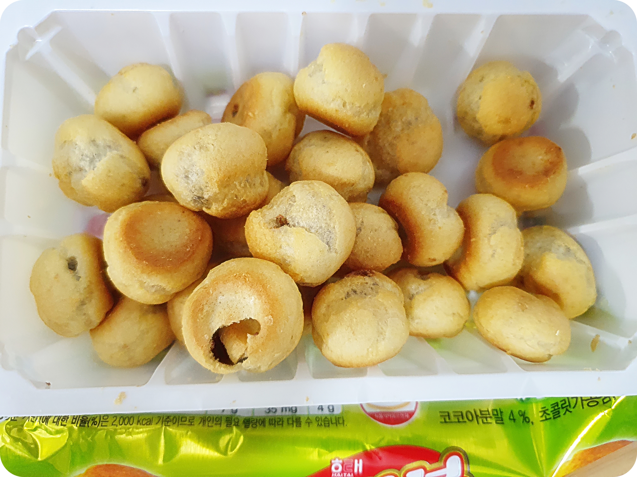 에어프라이어에 조리되며 수분이 날아가 눅눅했던 식감은 사라지고 초콜릿이 녹아 촉촉합니다.