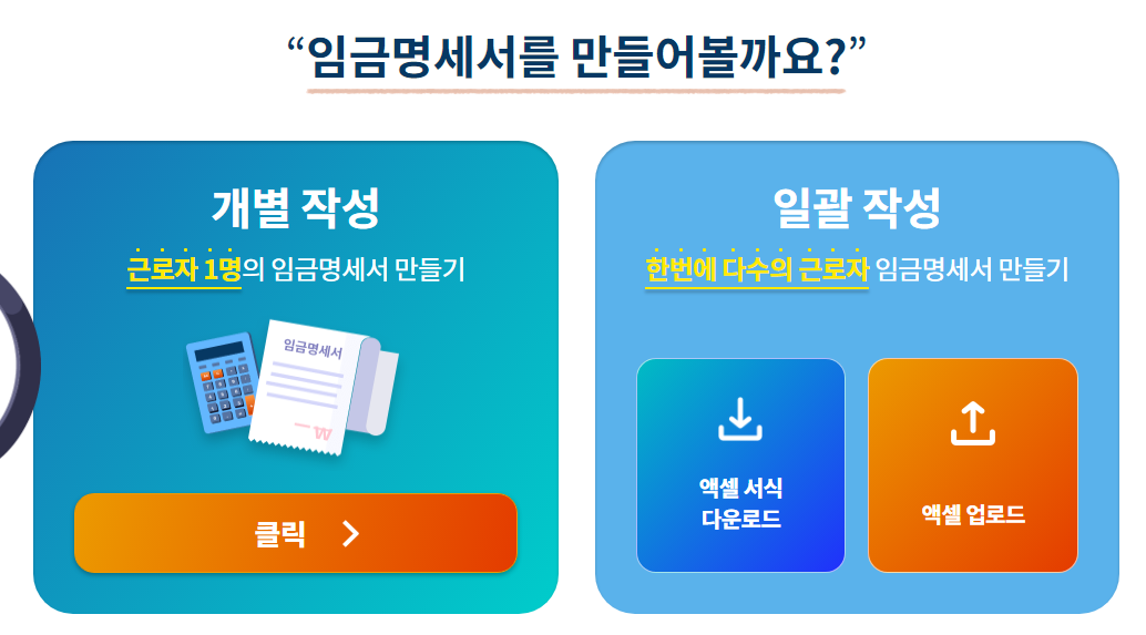 고용노동부에서는 명세서 작성이 어려운 사업자들을 위해 임금명세서 만들기 사이트를 운영하고 있습니다.